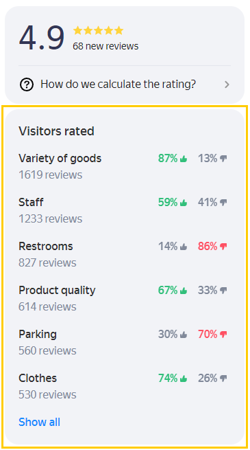 The business owner can see the current business rating and the number of new reviews in their Yango for Business account. To view this data, open About the business → Reviews → Visitors rated.